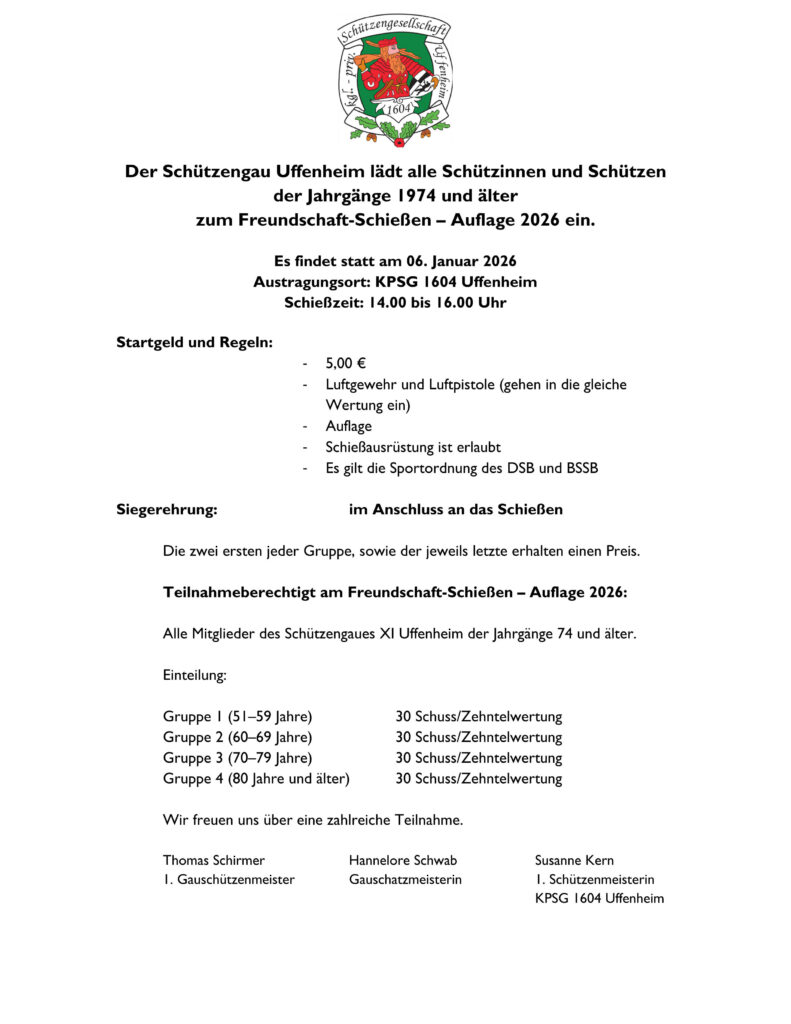 Der Schützengau Uffenheim lädt alle Schützinnen und Schützen der Jahrgänge 1975 und älter zum Freundschafts-Schießen – Auflage 2026 am 06.01.2025 im Schützenverein Lenkersheim herzlich ein.